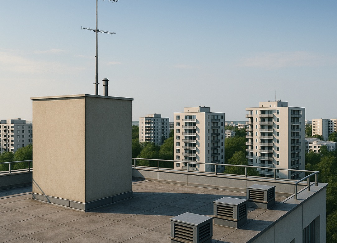 Rooftop with antenna and background view of panel buildings in the city.