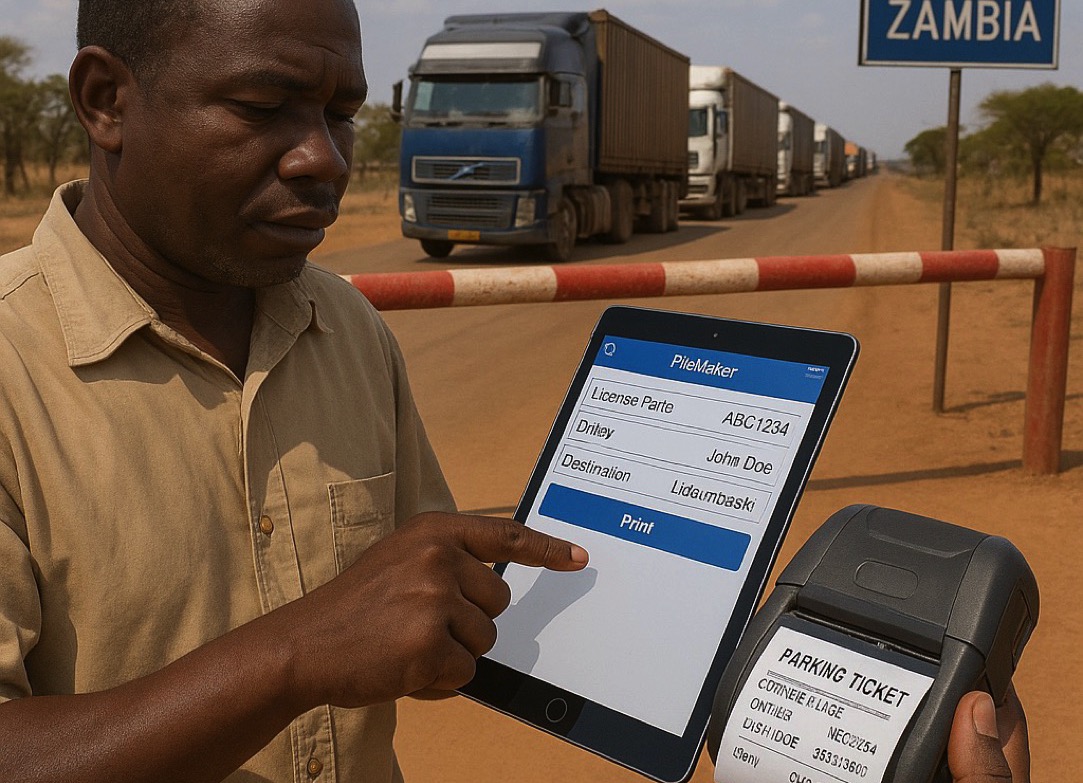 The customer operates a truck parking facility at the border between two African countries, where drivers wait during customs clearance. Operators responsible for raising the gates use iPads connected to a FileMaker database to record vehicle, driver, and transport information. The goal was to enable operators to quickly and easily print parking tickets on-site with all necessary driver details.