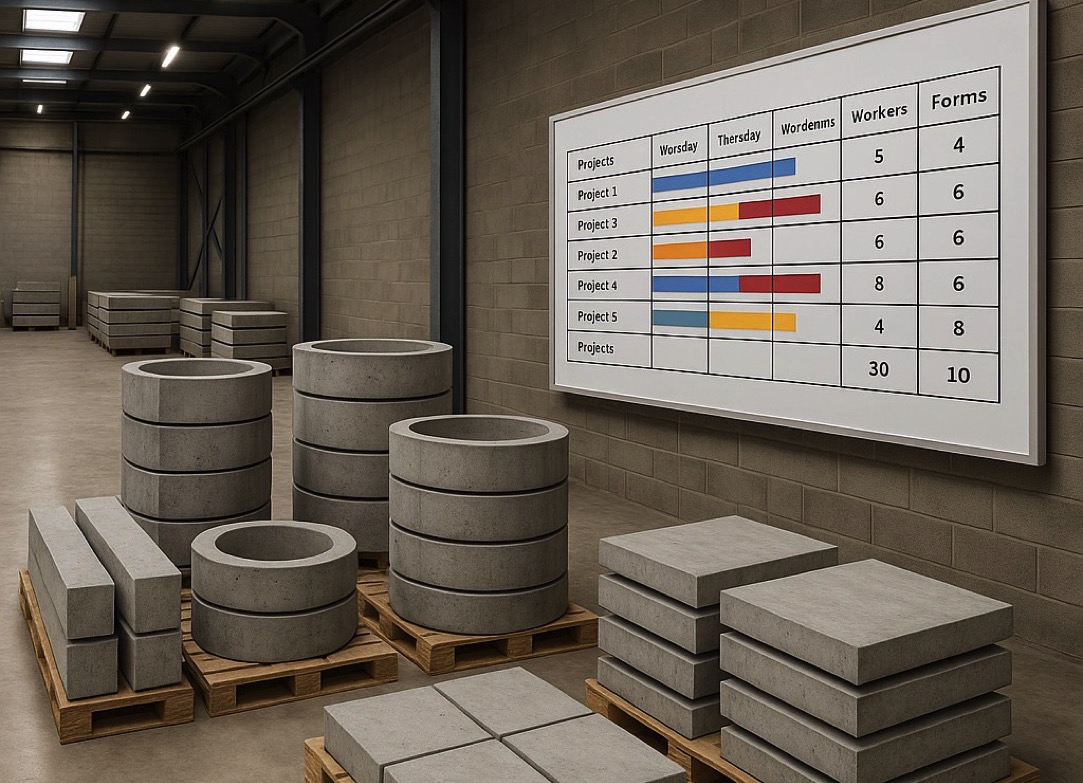 A manufacturer of concrete prefabricated elements, such as curbs, manholes, and other components, needed to optimize their production process. The main goal was to maximize the use of limited space in the production hall every day, while also considering limited workforce and the availability of production molds. Their original planning was done in Excel, which was slow and error-prone. Therefore, the customer requested a specialized tool for fast and accurate planning that would ensure maximum utilization of space, labor, and formwork.