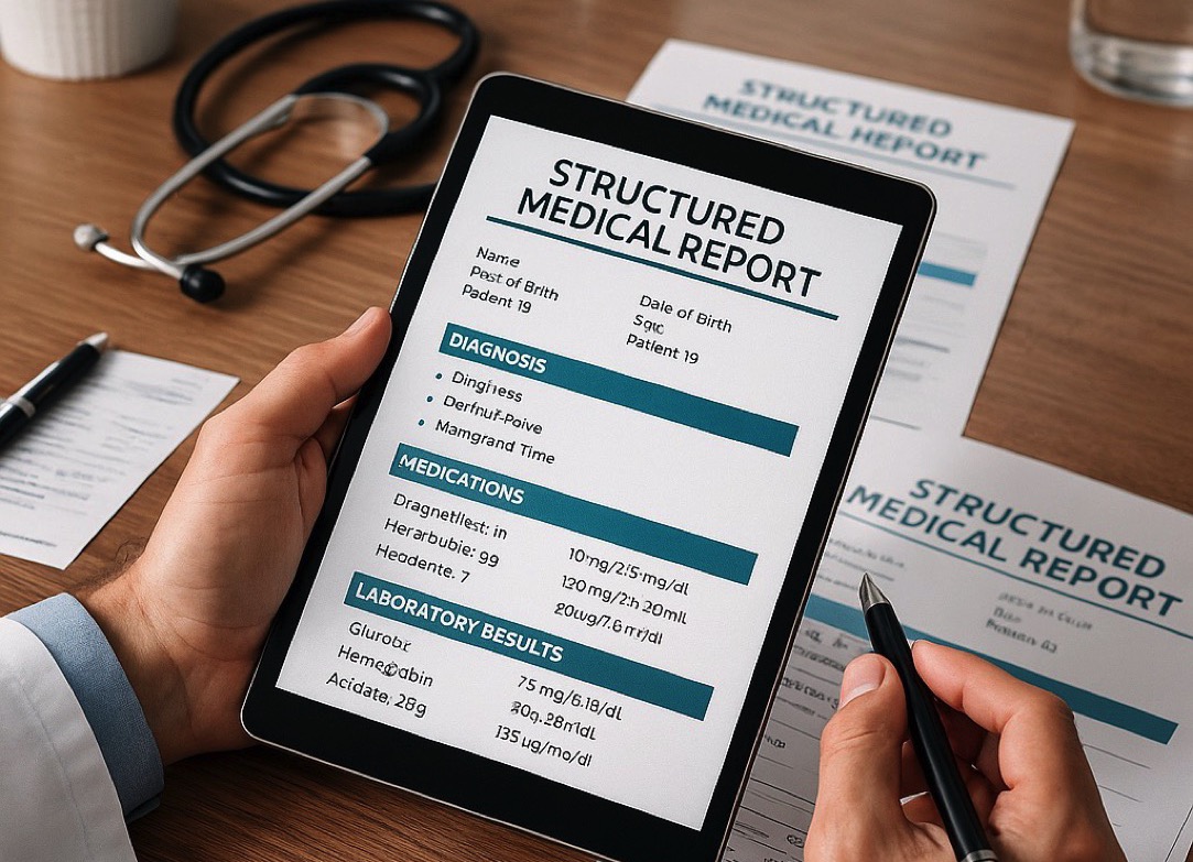 Lékaři mají k dispozici předpřipravené šablony, kde využívají zástupné znaky (wildcards) například pro jméno pacienta, datum narození nebo další údaje. Po načtení se tyto znaky automaticky nahrazují reálnými daty a lékař se soustředí pouze na vyplnění údajů o vyšetření.