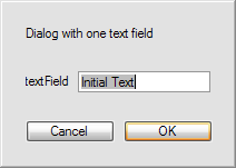 This will create a dialog with default buttons Ok and Cancel and one text field with label "textField" containing "Initial Text".