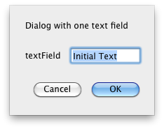 This will create a dialog with default buttons Ok and Cancel and one text field with label "textField" containing "Initial Text".