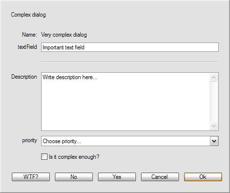 SDialog_InputDialog( "Complex dialog" ; "Ok¶Cancel¶Yes¶No¶WTF?" ; "caption¶Name:" ; "Very complex dialog" ; "text¶textField" ; "Important text field" ; "separator" ; "textArea¶Description¶lines=8" ; "Write description here..." ; "menu¶priority" ; "Very High¶High¶Normal¶Low¶Very Low" ; "Choose priority..." ; "checkbox¶Is it complex enough?" ; 0 )